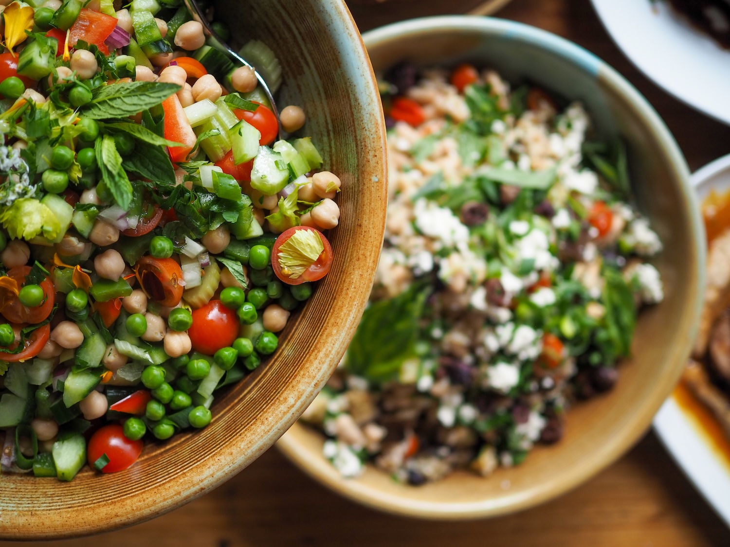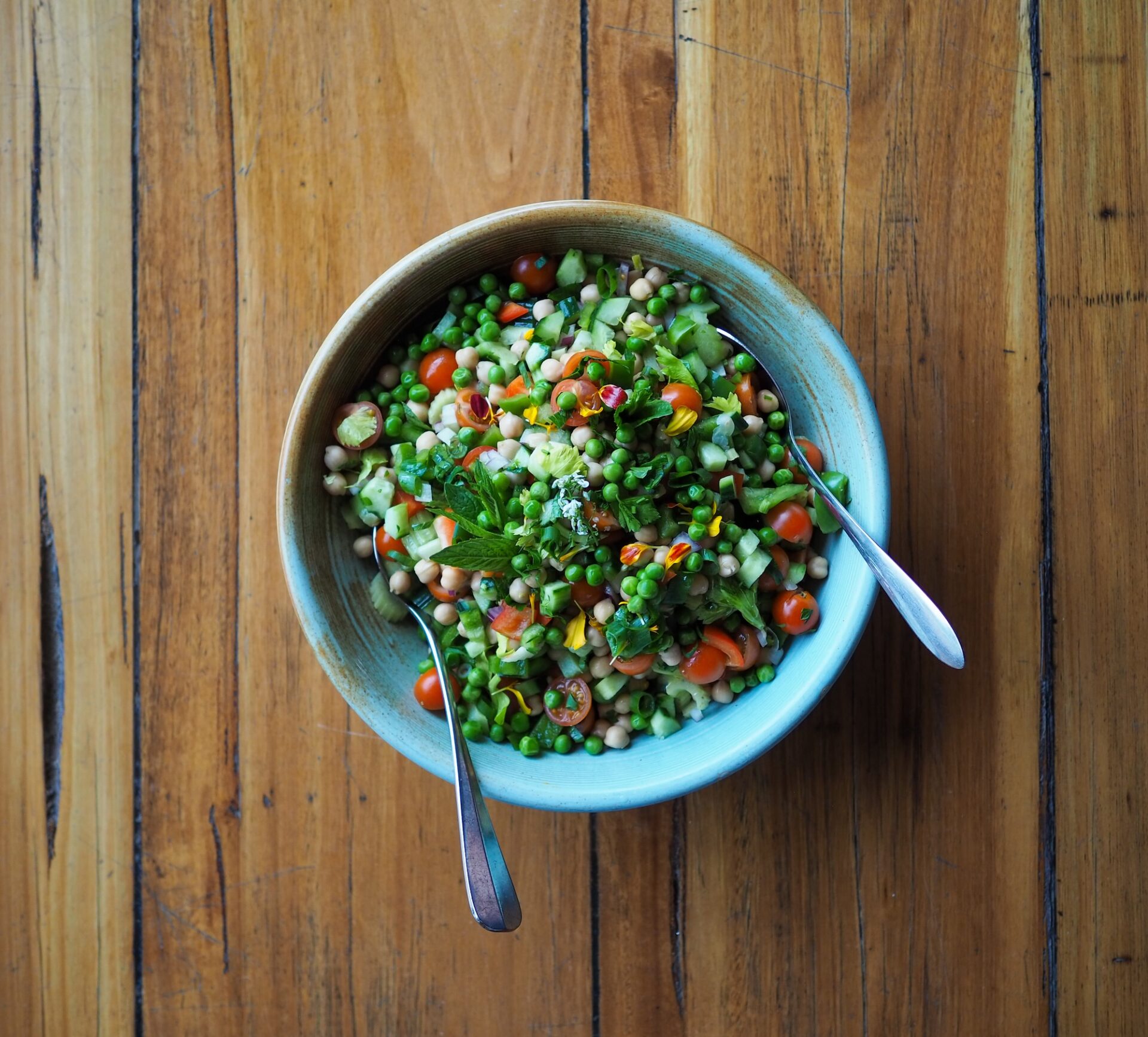 - Chickpea, cucumber, capsicum, Spanish onion, peas, tomato & fresh herb salad (gf,v,vg,df)