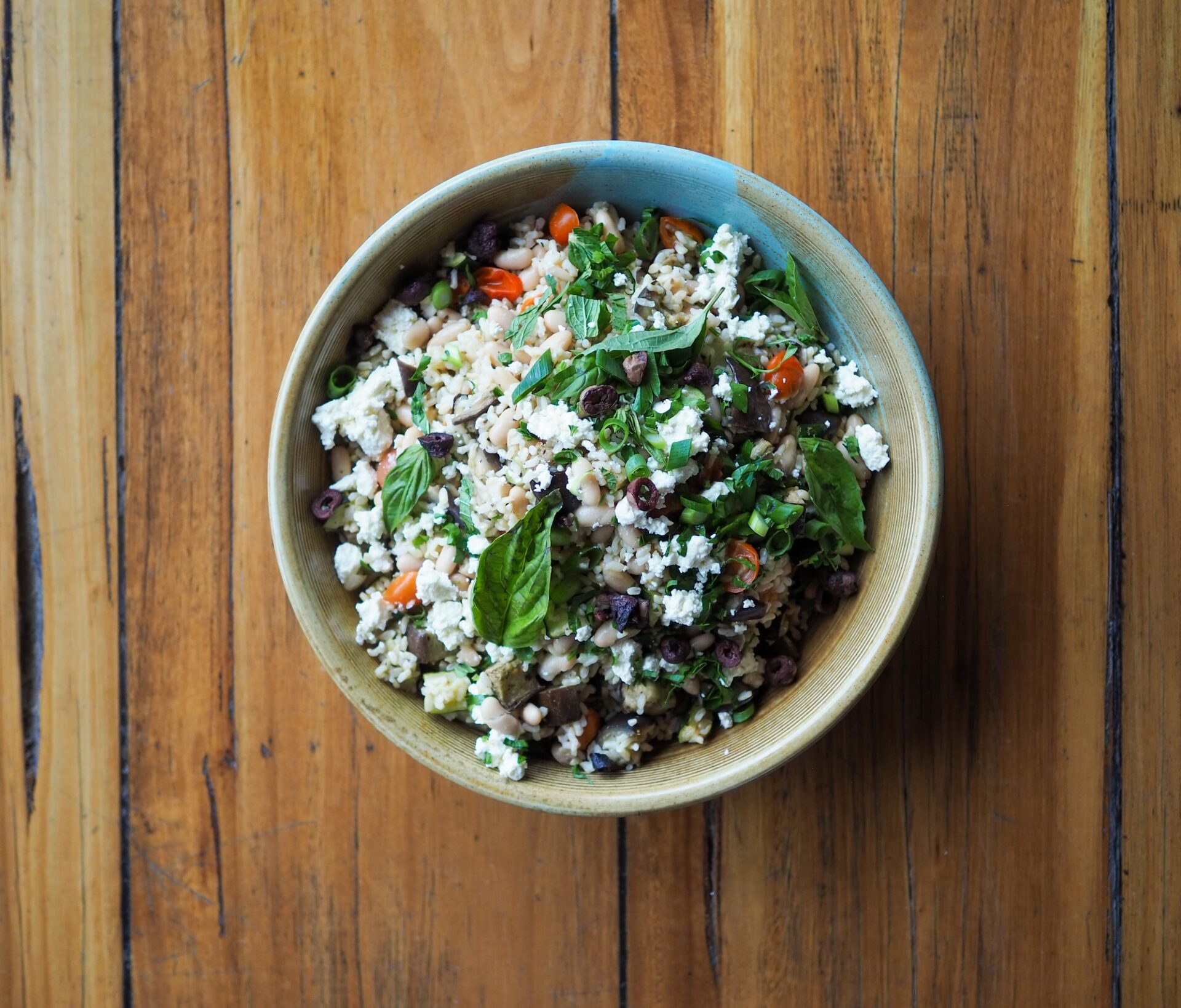 - Brown rice, cannellini bean, basil, tomato & feta salad (gf,v)
